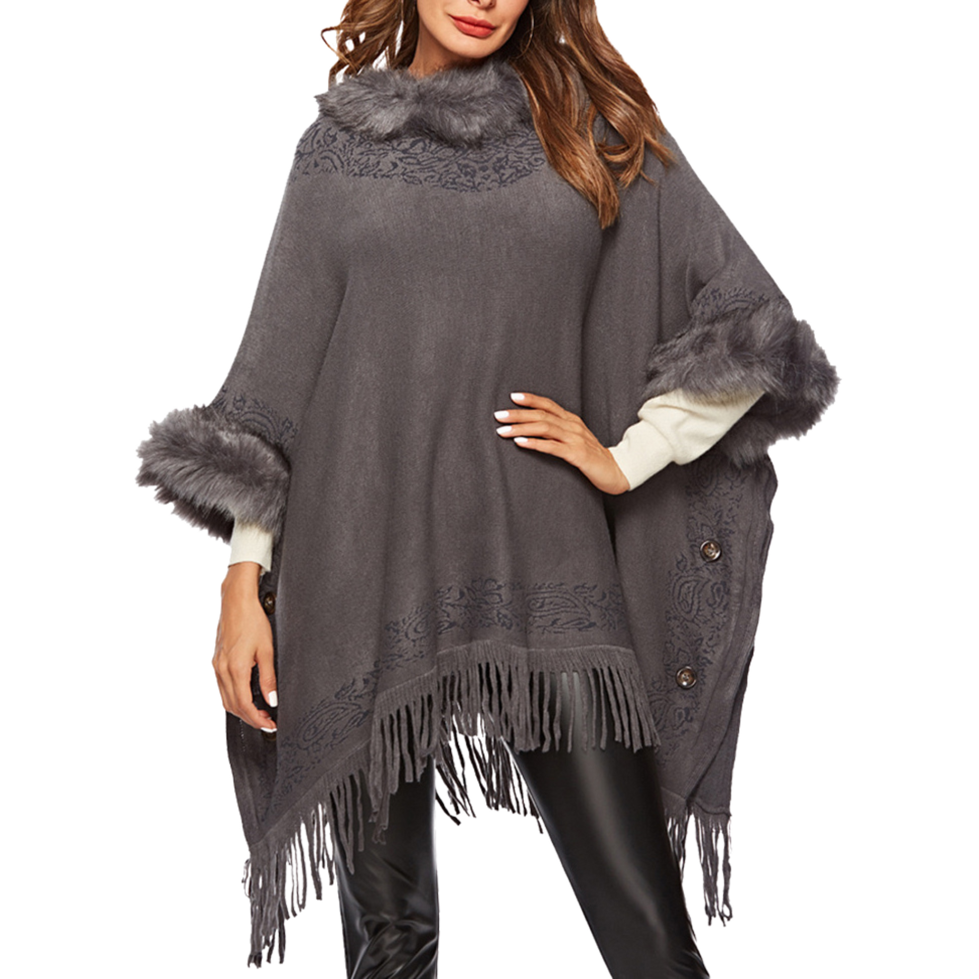 Wrap yourself in effortless elegance with this faux fur trim knit poncho cape, designed to elevate your cool-weather style. The soft knit drapes beautifully, while the plush faux fur collar and playful fringe detailing add texture and movement. Lightweight yet cozy, it’s the perfect layering piece for city strolls, coffee dates, or weekend getaways. Its relaxed silhouette flatters all shapes, making it a versatile essential from desk to dinner. Pair it with denim or over a sleek dress for instant polish. A luxe, gift-ready staple that transitions through seasons—this ruana is a must-have for your collection.