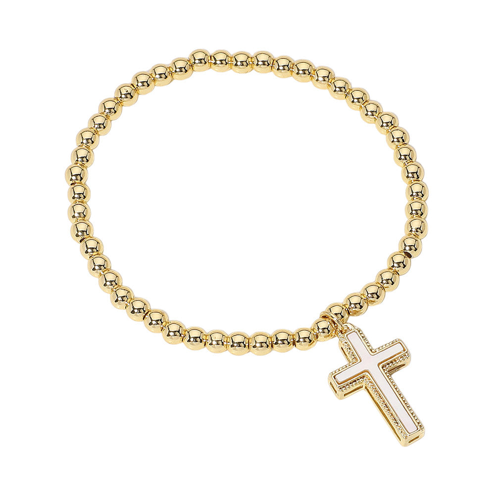 • Stainless Steel Ball Mother of Pearl Cross Charm Beaded Stretch Bracelet